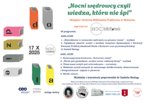 Miejska i Gminna Biblioteka Publiczna w Wieluniu zaprasza na wydarzenia w ramach projektu „Październik z Reymontem”. Wydarzenia będą się odbywać w okresie od16 X do 28X 16.10.2025 ), w czytelni MiGBP w Wieluniu, o godz. 10.00 „Wiejska chata zmysłami przedszkolaka, czyli „Chłopi” Reymonta w odbiorze dzieci”. Podczas zajęć, najmłodsi uczestnicy zapoznają się z życiem na …