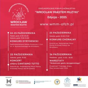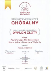 Piękny występ Chóru Powiatowego Młodzieżowego Domu Kultury i Sportu w Wieluniu podczas sobotniego Ogólnopolskiego Konkursu Chóralnego w ramach Ogólnopolskiego Forum Chóralistyki we Wrocławiu (25 X 2025 r.) potwierdzony został Złotym Dyplomem (za najwyższą liczbę punktów w kategorii chórów dziecięco-młodzieżowych), wyróżnieniem za najlepiej wykonany utwór kompozytora zagranicznego (tytuł utworu: Ponetemente muz. Lorenzo Donati) oraz nagrodą dla najlepszego dyrygenta o czym na swoim FB informuje Powiatowy Młodzieżowy Dom kultury i Sportu w Wieluniu.
