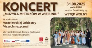 31 sierpnia Wieluński Dom Kultury zaprasza o godz. 20:00 do parku im. Żwirki i Wigury na koncert „Muzyka mistrzów w Wieluniu” w wykonaniu Wrocławskiej Orkiestry Wszechmuzycznej, pod batutą Dominika Tomasza Kozłowskiego wraz z solistką Magdaleną Dudek. Na program koncertu składają starannie wybrane części z I Suity Orkiestrowej Maurycego Moszkowskiego oraz utwory ze znanych i cenionych musicali jak „Nędznicy”, „Piękna i Bestia” czy właśnie „Skrzypek na dachu”.