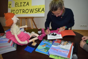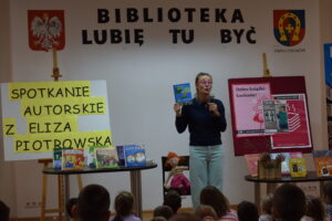 Eliza Piotrowska jest znaną i cenioną autorką książek dla dzieci, a także ilustratorką. To autorka wielu popularnych tytułów, które cieszą się dużym uznaniem wśród młodych czytelników i krytyków. Jej książki charakteryzują się ciepłym humorem, pięknymi ilustracjami oraz wartościowymi przesłaniami. Podczas spotkania autorka opowiadała o swojej twórczości, zdradzała kulisy powstawania książek o Cioci Jadzi, a także odpowiadała na pytania. Dzieci miały okazję porozmawiać z Elizą Piotrowską, kupić książkę i otrzymać autograf. Nie zabrakło również wspólnego czytania fragmentów książek.