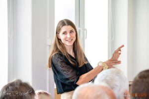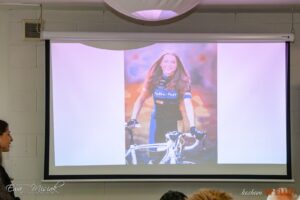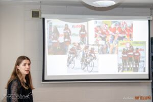 Już od pierwszych chwil dało się wyczuć niezwykłą atmosferę. Sala była wypełniona kibicami a przybyli goście, miłośnicy kolarstwa, pasjonaci sportu i mieszkańcy, z ogromnym zainteresowaniem słuchali opowieści bohaterki spotkania. Dominika opowiadała o swojej drodze do zawodowego kolarstwa, o trudach codziennych treningów, o chwilach pełnych satysfakcji ale i o wyrzeczeniach, które stały się nieodłącznym elementem jej sportowego życia.