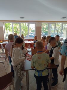 Kulinarna przygoda zakończyła się degustacją przygotowanych potraw, co było prawdziwą ucztą dla podniebienia. Na stole zagościła zupa owocowa z sezonowych oraz suszonych owoców podana z kaszą manną, kluski leniwe z sera pod zasmażką z bułki w towarzystwie słodkich borówek oraz jajecznica ze szczypiorkiem. Każdy z uczniów otrzymał na pamiątkę książkę „Kulturalnie Lokalnie Ze Smakiem”.