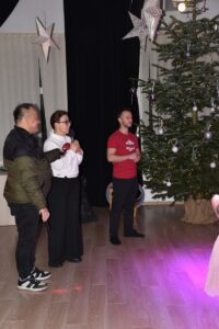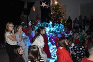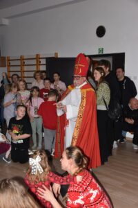 Najważniejszym momentem spotkania okazała się oczywiście wizyta Świętego Mikołaja. Gdy na sali zapadła chwila ciszy a później zza drzwi pojawiła się charakterystyczna sylwetka w czerwonym stroju, dziecięce serca zabiły mocniej. Najmłodsi z entuzjazmem ruszyli w stronę gościa, nie mogąc doczekać się rozmowy, wspólnego zdjęcia i być może małego upominku. Ten widok, pełen autentycznego zachwytu i magii, był kwintesencją świątecznej atmosfery, której nie sposób oddać słowami.